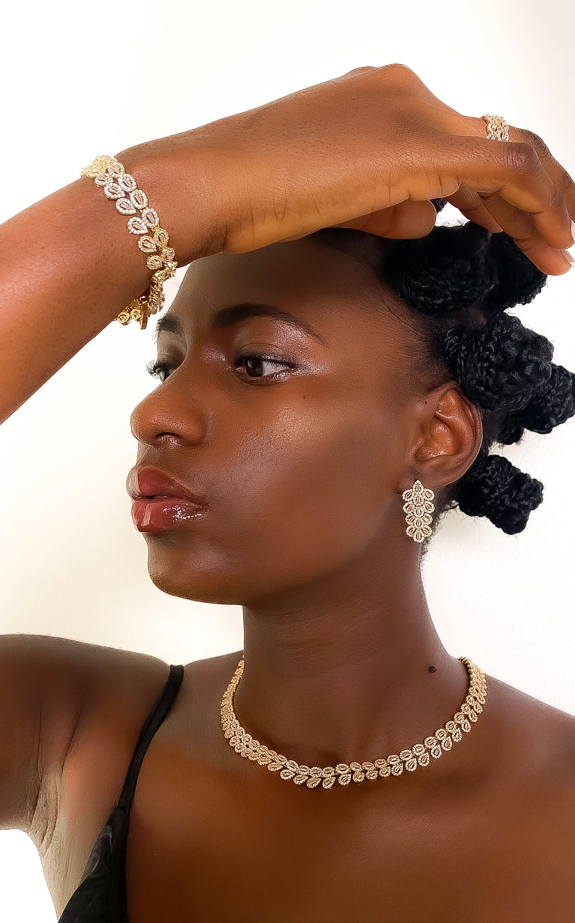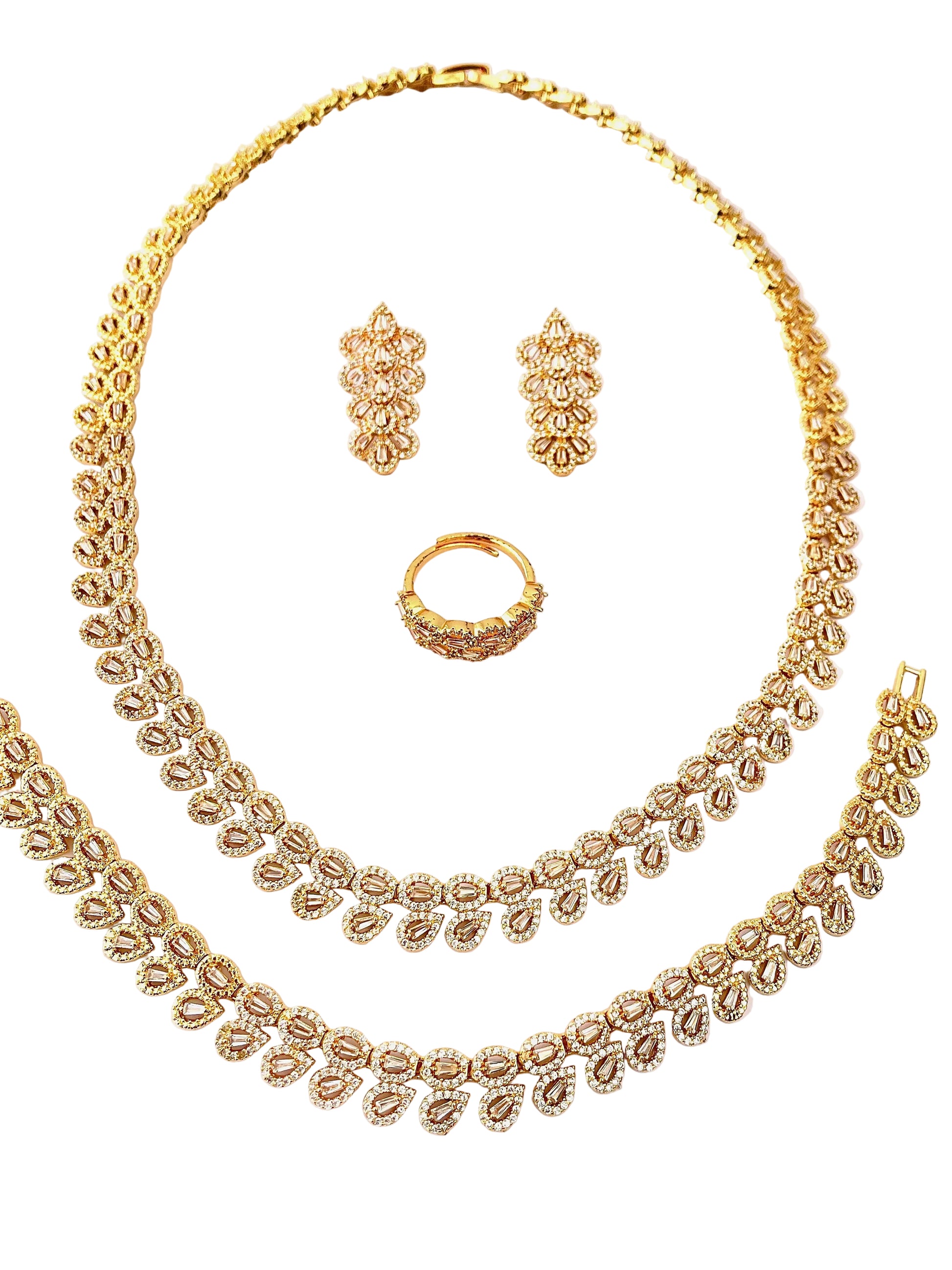 Indulge in The Nike Set, a harmonious ensemble of meticulously crafted jewelry, where each piece—earrings, necklace, ring, and bracelet—effortlessly intertwines elegance with luxury. Adorned with scintillating zirconia, this collection in radiant gold exudes opulence, transforming any occasion into an exquisite affair draped in sophistication.