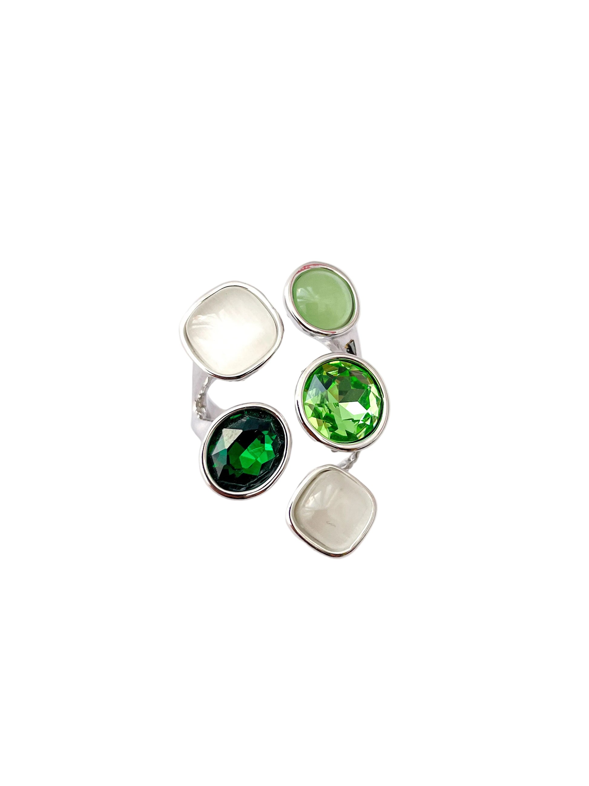 A sleek silver-tone ring featuring radiant green stones for a bold yet elegant finish. Designed to stand out, this statement ring is perfect for special occasions or adding a pop of color to everyday looks. Timeless, stylish, and effortlessly chic.